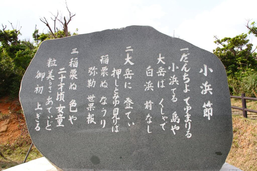 島で最も高所である大岳を登る入口に「小浜節」の歌碑が建立されていますので、今回は歌碑にある歌詞と大意をご紹介いたします。