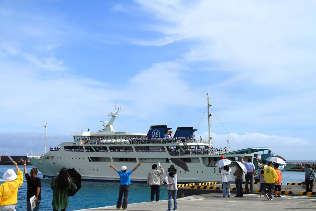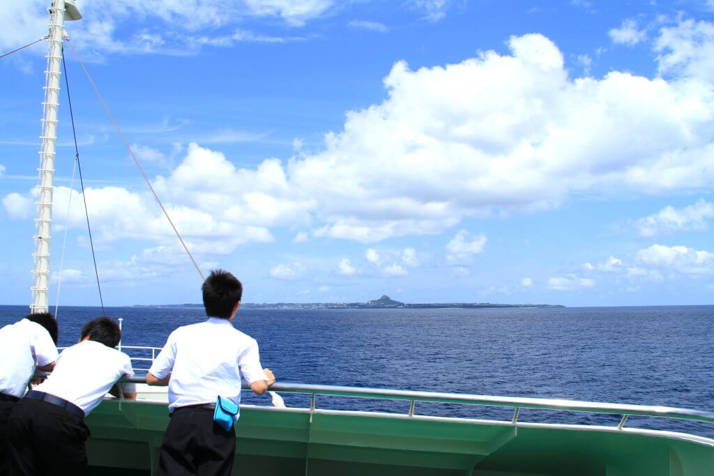 本部港からフェリーで約30分。瀬底島や本部半島を眺めながら伊江島へ近づくと、「砂持節」の旋律に乗せて