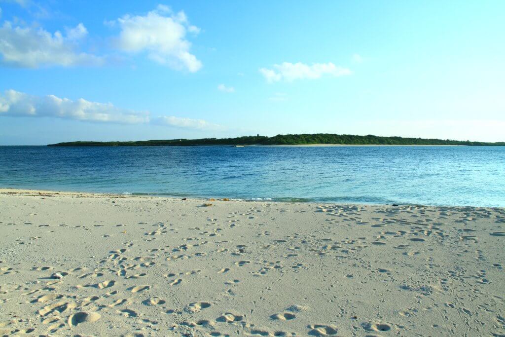 集落から両側緑だらけの一本道歩いて浜崎へ出ると、手に取るように下地島が見えます。大潮のときはリーフづたいに歩いて渡れそうな上地島と下地島ですが、「上地島と下地島では言葉が違います」と修さん。