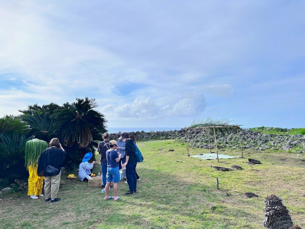 君南風が3ヶ所の拝みを終えてしばらくすると、ウサンデーのお菓子「かるかん」を乗せたお盆を手にした女性が廻ってきました。ウチナーグチの「ウサンデー」はお下がり、神仏へのお供え物をいただくことです。