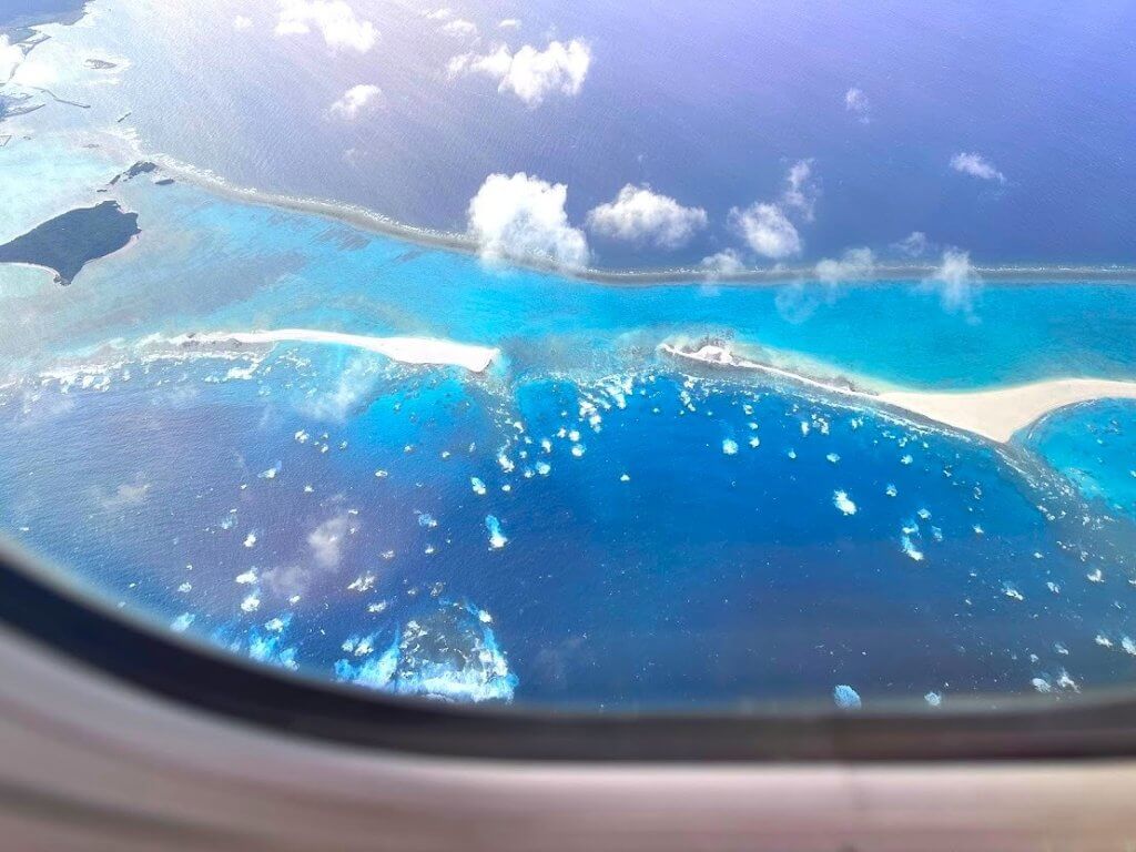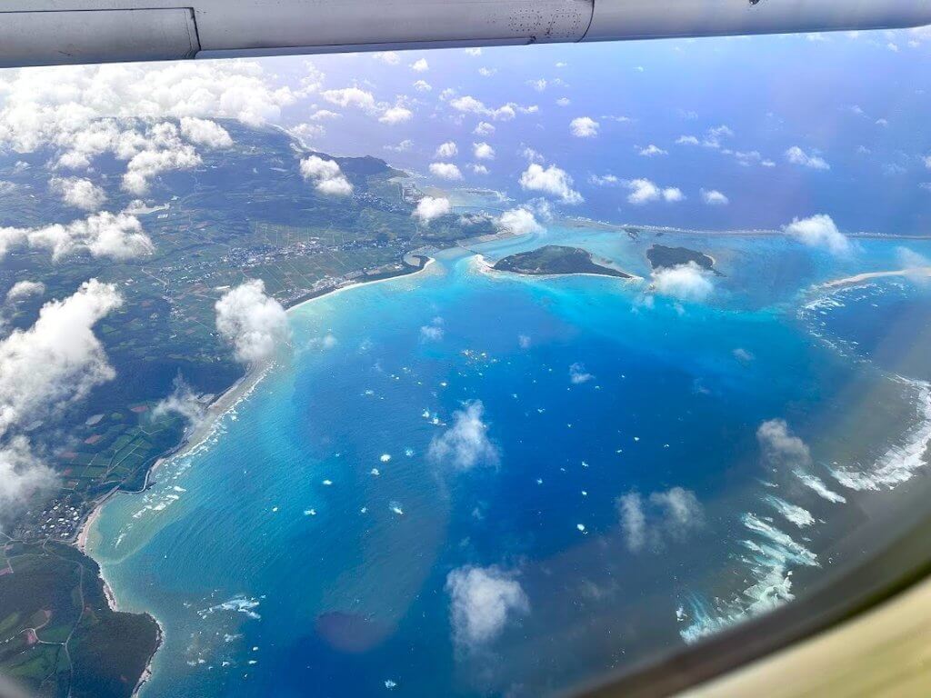 飛行機が飛び立つと久米島と橋で繋がる奥武島(おうじま)が見えてきました。