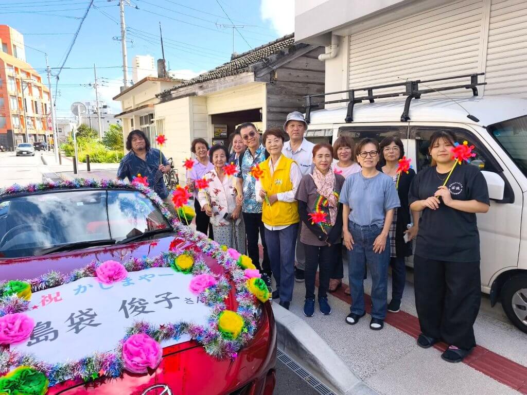 私はからじを結って琉装ウシンチー。パレードでは最後尾の音響車に乗ってMC & 祝賀会では司会を務めさせていただきました。