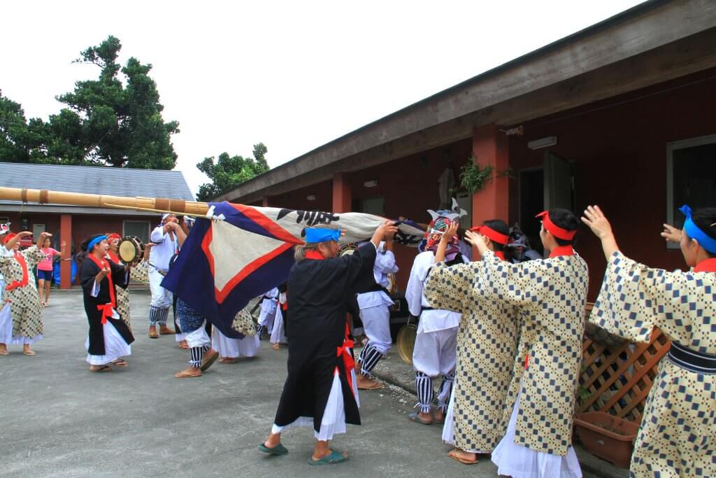 「サァサァサァサァ」との掛け声で賑やかに集落内を練り歩き、長い旗頭を横にしてお家や建物のなかに入れては出して、入れては出してと役員宅や公共施設をみんなで歩いて廻ります。