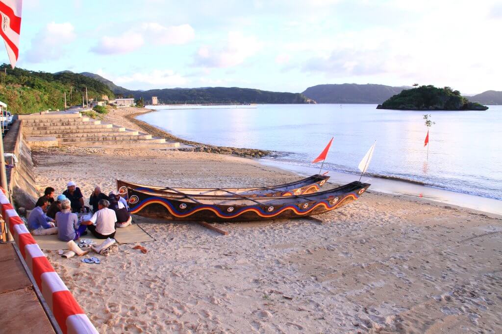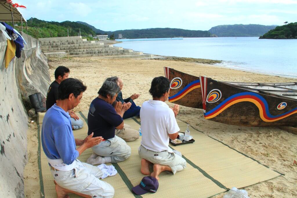 舞台から左下方の浜では2艘のサバニを前に、数名の男性たちが鏡のように穏やかな海に向かい、神妙な面持ちで祈りを捧げているのが見えます。明日サバニを漕ぐ船子たちの安全と明日の神行事が滞りなく行われること、無事ユガフ(世果報)を持ち帰れることを祈っているのでした。