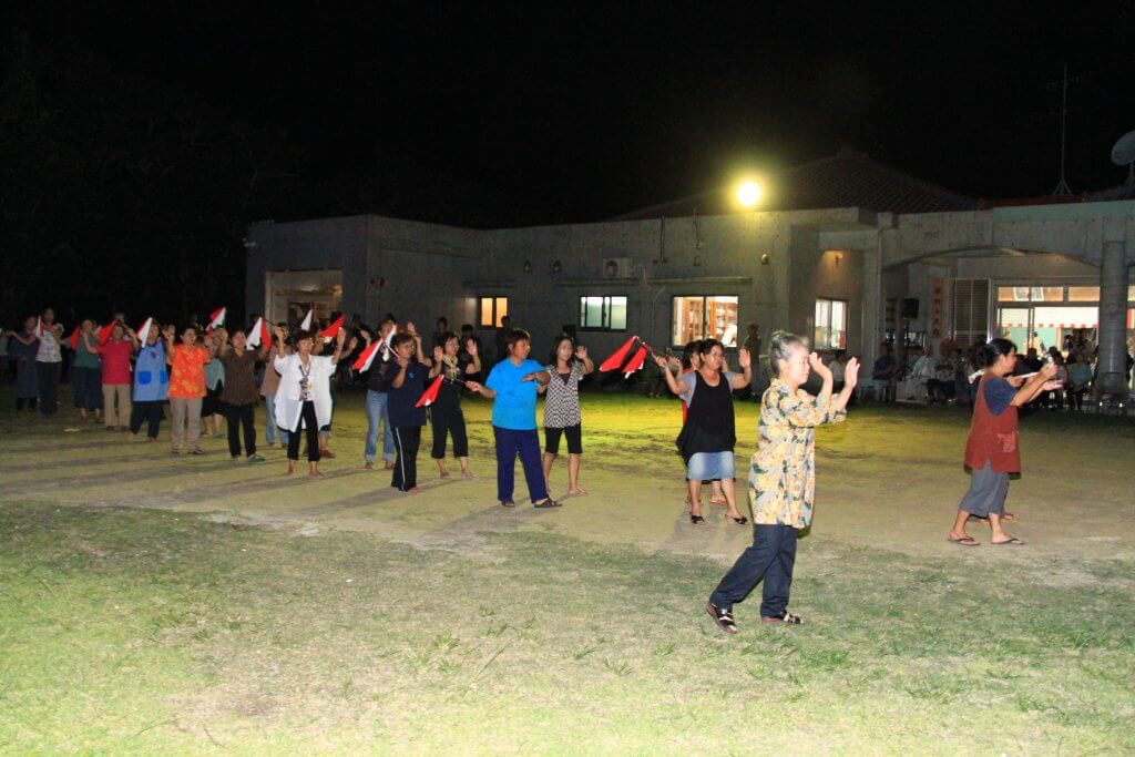 公民館の軒先には椅子が並べられ、シージャ(目上)方が座っています。公民館の広場の隅で熱のこもった練習を繰り返す子どもたち、熱心に最後の指導をなさる方、楽しげに飲んでいる方、真剣に観ている方、十人十色さまざまです。