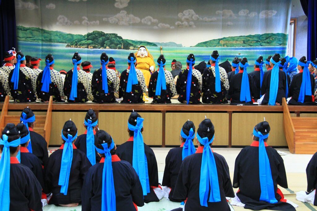 ミリク世話役の石垣金星さんに導かれるようにして、全剛さんは中央の椅子に腰掛けます。原則としてミリク様に近付いたりお話ができるのは世話役の方だけ。ミリク様の面をつけるのも外すのも世話役の役目です。